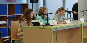 Danach gehörte die ganze Aufmerksamkeit des Zuschauerraums den Teilnehmerinnen des Vorlesewettbewerbs und somit durfte die erste Runde beginnen. Die Klassensiegerinnen stellten sich vor und erzählten kurz über das Buch, aus dem sie vorlesen wollten. Die Schülerinnen hatten – nach vorgegebenen Regeln – drei Minuten Zeit, um ihren Wahltext vorzulesen.
